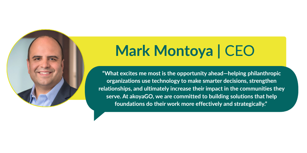Mark Montoya has been named Chief Executive Officer of akoyaGO, Inc., marking the next step in the company’s evolution as foundations increasingly turn to technology not just to operate their organizations, but to innovate and strengthen their impact.